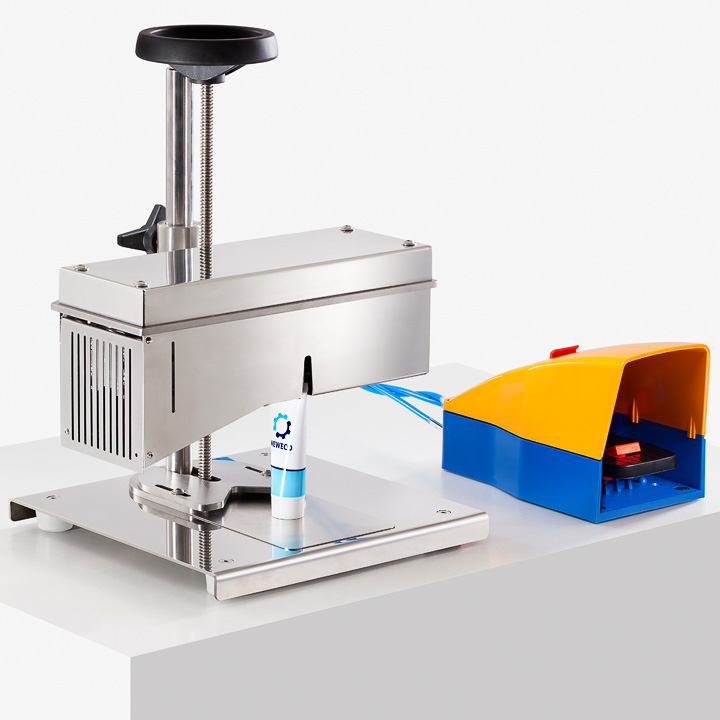 Der NEWECO Tubenschneider für Kunststofftuben POD-400 EURO-Loch Stanzung wird zur Trimmung von PE- und Laminattuben im Anschluss an die Versiegelung verwendet. Die Tuben werden manuell in die Abschneidevorrichtung eingesetzt und über das Pedal betätigt. Nach dem Schneidezyklus werden die Tuben entnommen. Durch die spezielle Breite der Siegelnaht von 25 mm, können die Tuben mit einer EURO-Loch-Stanzung versehen werden.