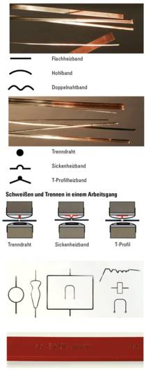 Zum Verschweißen und gleichzeitigen Trennen der Folie in der Naht sind Trenndrähte, Sickenheizbänder und T-Profilheizbänder ebenfalls in verschiedenen Abmessungen lieferbar: